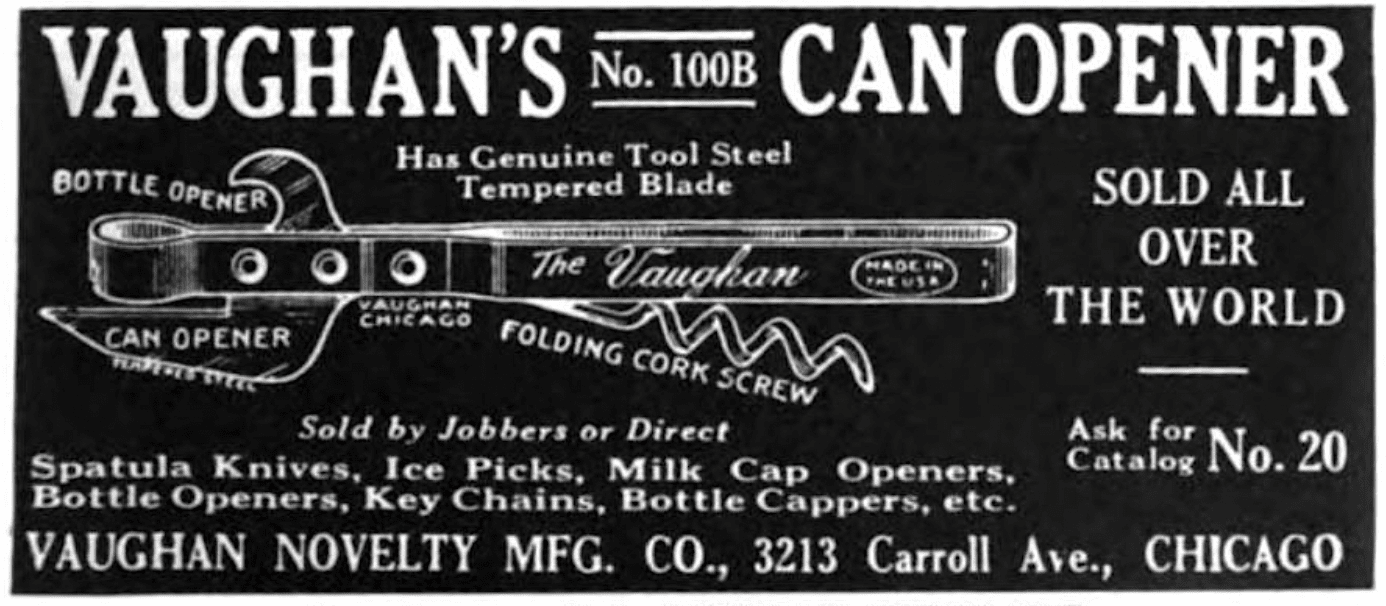 “Vaughan Novelty Manufacturing Co., which claims to be the world’s largest manufacturer of can openers, said today a pressing demand has forced it to expand facilities and that it soon would be producing 100 million beer can openers a year.”