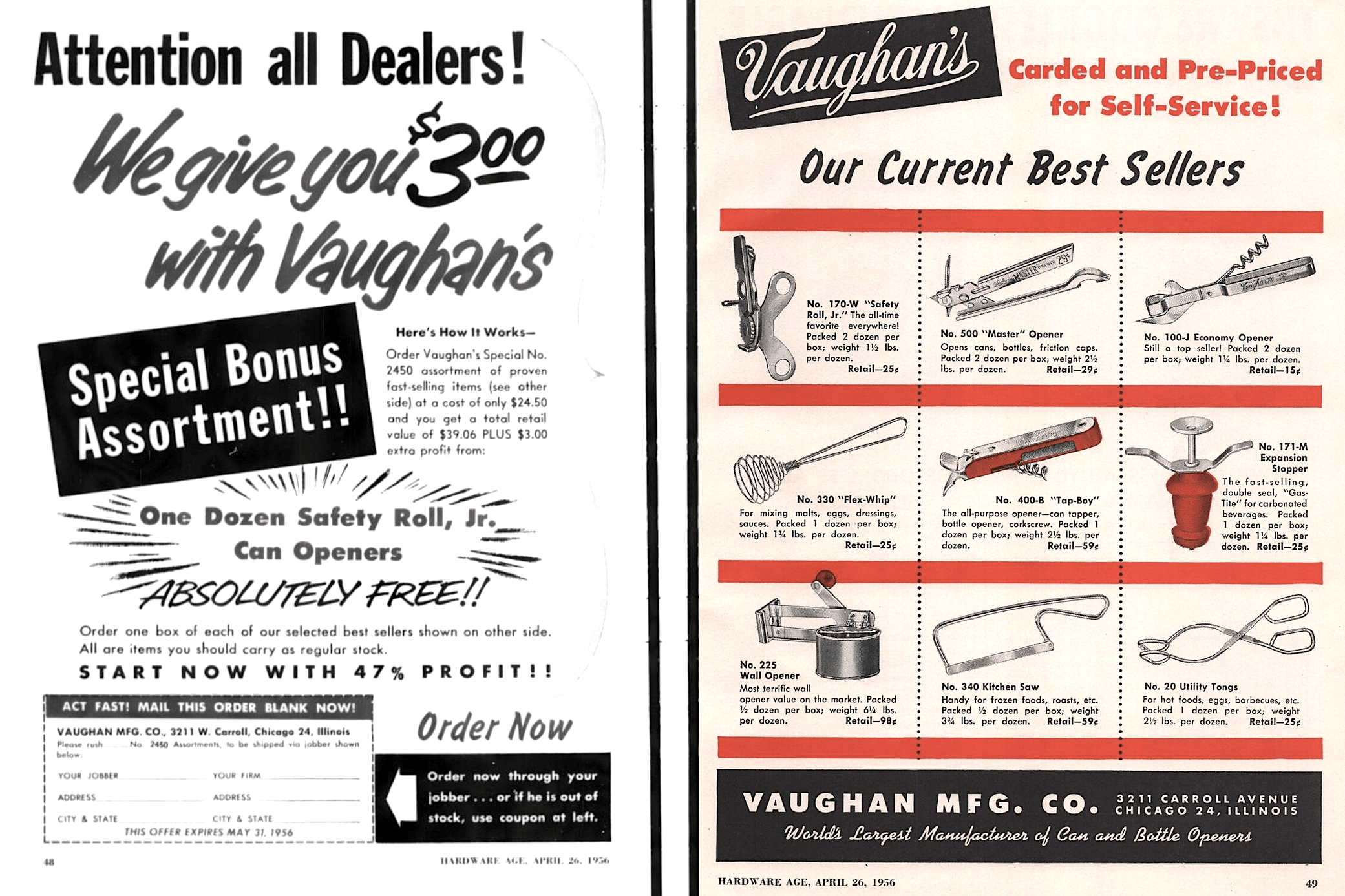 Even so, as late as the 1970s, Vaughan’s own catalog copy still referred to the company as the “largest manufacturer in the opener field,” with “maximum usefulness and attractiveness” built into each product. “We will strive to improve our industry for the mutual benefit of our customers and ourselves.”