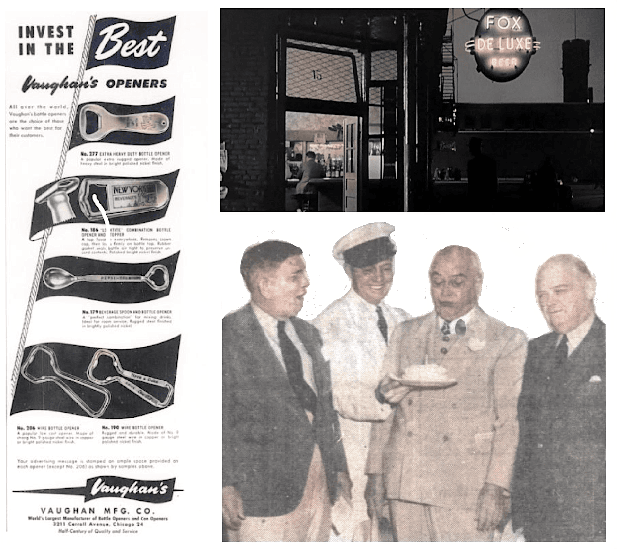 [Left: 1950 ad for Vaughan’s Openers. Top Right: Fox DeLuxe neon sign, circa 1940s. Bottom Right: Harry L. Vaughan is presented a cake on his 70th birthday, 1941, while attending his favorite race track in Miami, Florida]