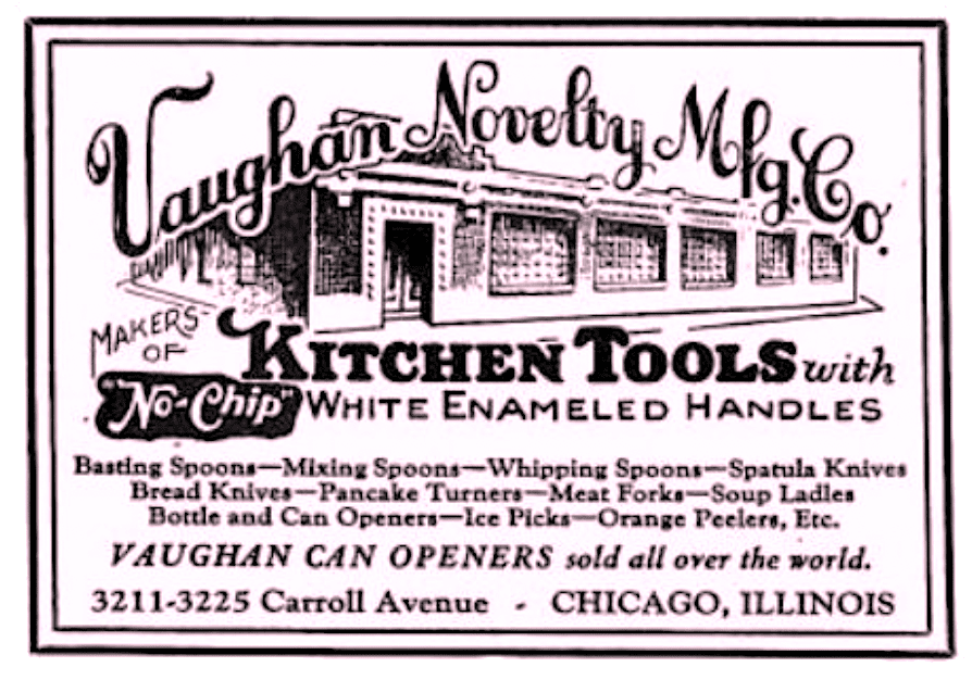 “. . . Still operating on its original [not actually original] site at 3211 Carroll, the factory, officially Vaughan Novelty Manufacturing Co., employs 125 persons whose main work is the production and packing of the openers.