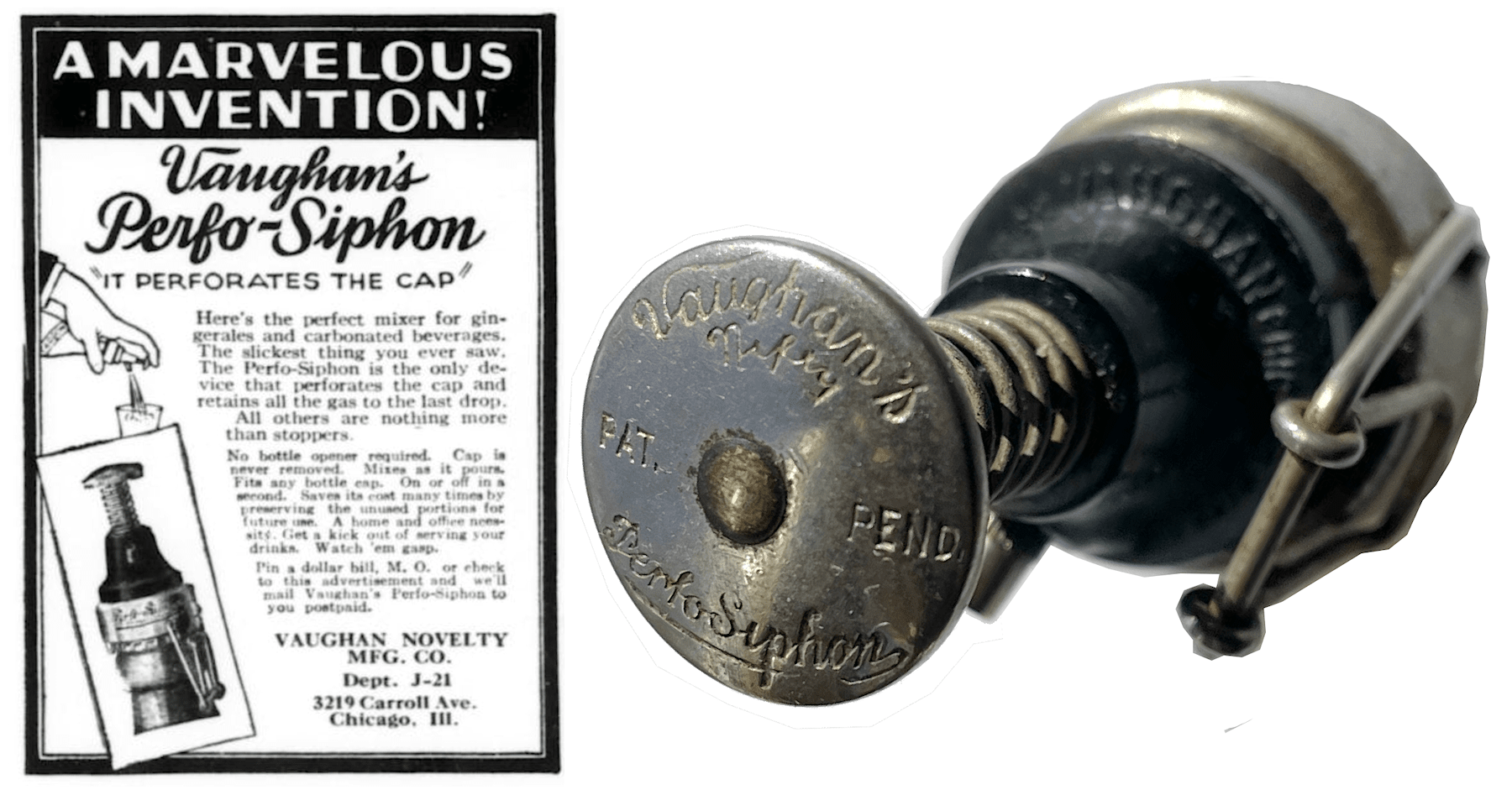 Even during the early 1930s, when most manufacturers were wallowing in the economic sinkhole of the Depression, Chicago’s Vaughan Novelty MFG Company was enjoying a significant upswing, cranking out truckloads of pocket-sized paraphernalia from its plant on Carroll Avenue. This included not only various weapons for dislodging cola bottle caps (not beer bottles, obviously, since they were illegal!), but also some ingenious tools for actually keeping said bottles sealed even as they poured, such as the “Perfo-Siphon” device in our museum collection.