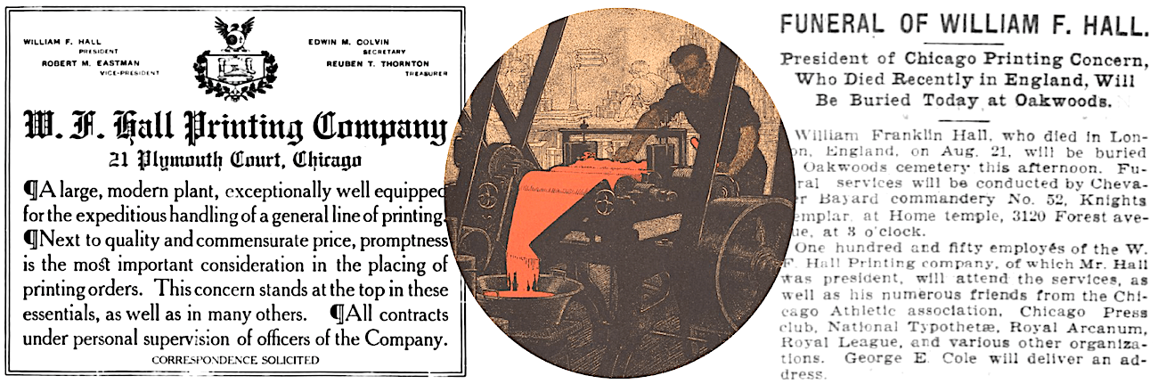 [Left: W. F. Hall ad from 1906. Center: Illustration of print industry worker from 1909 edition of the Inland Printer. Right: 1908 Tribune notice of the funeral of William F. Hall]