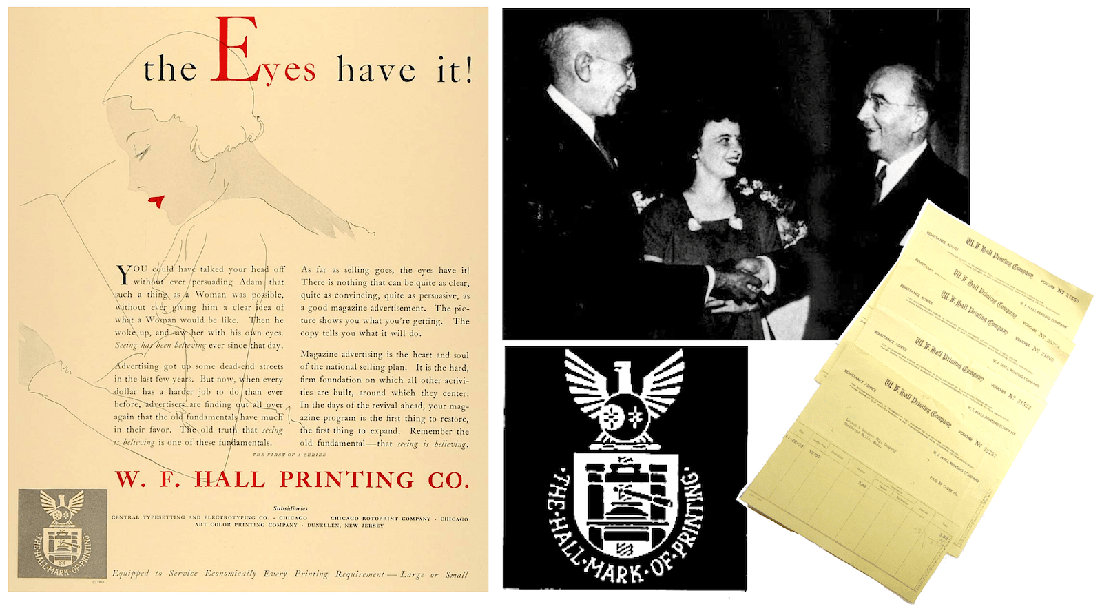 [Left: W. F. Hall ad from 1934 encouraging companies to re-invest in magazine advertising during the Depression. Top Right: Hall chairman Frederick Secord (left) greets company president Alfred Geiger, with employee Dorothy Frangiamore in between them. Bottom Right: A W. F. Hall “Hall Mark of Progress” logo from the 1930s and some ephemera with company letterhead.]