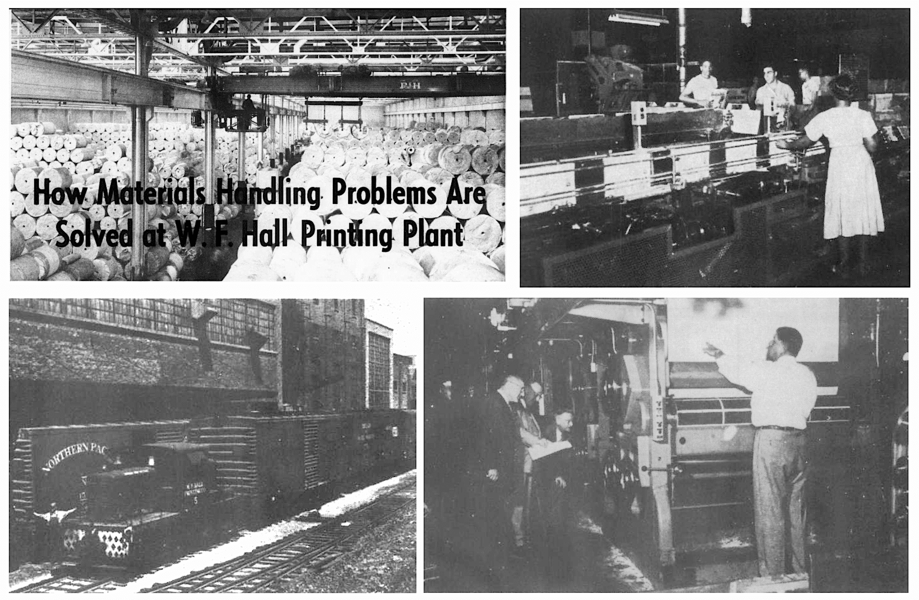 [Top Left: Photo and headline from 1949 Inland Printer article. Bottom Left: W. F. Hall’s private railroad, pictured in 1955. Top Right: Magazines being moved from a Hall gathering machine into a tumbler trimmer, 1955. Bottom Right: A new ink transfer system is inspected by Hall managers Adam Moses (VP of Engineering), Carl Braun (VP of Sales), Arthur Knol (VP of Manufacturing), and John Maxwell (Superintendent of Rotary Dept.), 1955]