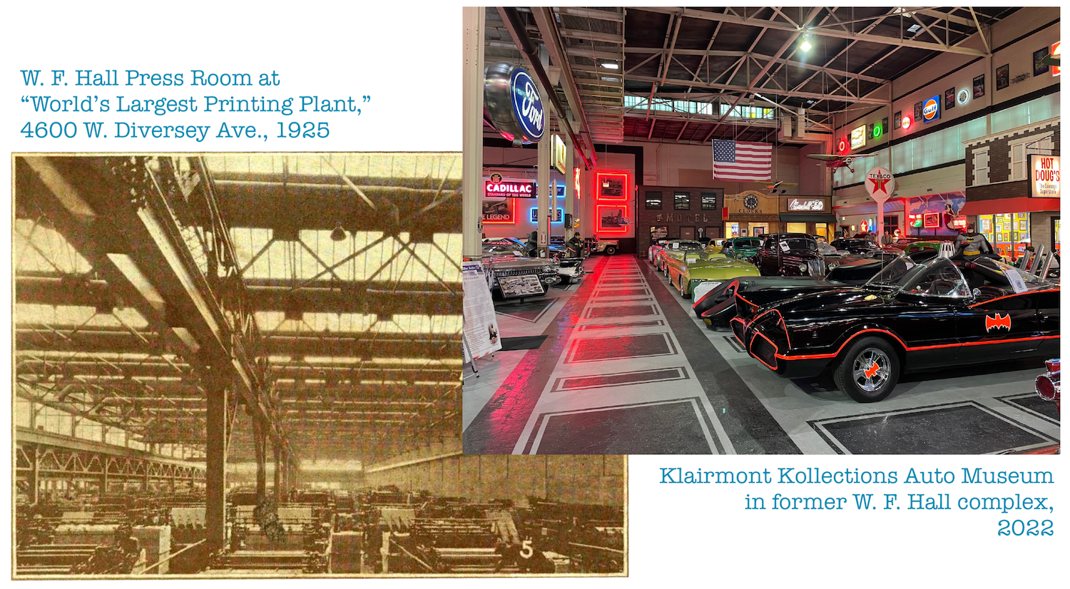 These days, the atmosphere at the old W. F. Hall HQ is considerably more relaxed. As a loose tie-in to the company’s days as a printer of automobile magazines, part of the long abandoned Cragin plant (specifically a building that housed its Rotoprint subsidiary) has now been converted into Chicago’s largest classic automobile museum, Klairmont Kollections. . . . Since 2022, it’s also been the home of a little exhibit called the Made In Chicago Museum.