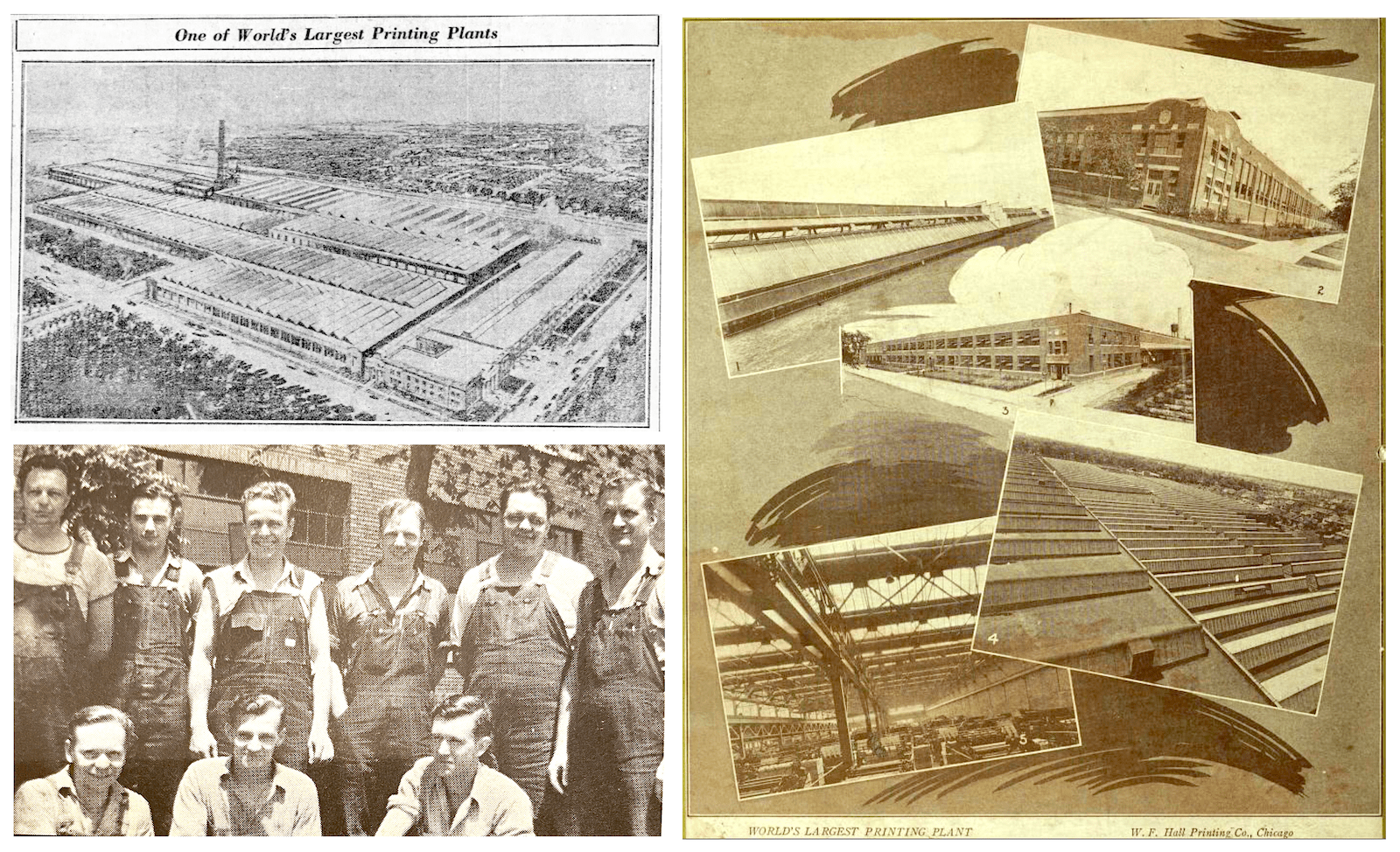 [Top Left and Right: Views above and around the new W. F. Hall plant in 1925. Bottom Left: Photo of “the old Rotary Gang,” outside the factory, circa late 1920s or 1930s. The men, as identified in an issue “House Dope” years later, are “Plano, H. Michaels, Joe Marek, E. Thompson, C. Fleeger, J. La Buda, Emmerling, E. Ralstab, and J. Kelly (the latter lost overseas)”]