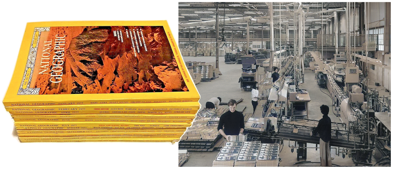 [When W. F. Hall acquired the contract to print National Geographic in 1977, it further pushed the company’s move away from Chicago toward more affordable, modern plants in the southern states. Pictured above is a Hall plant in Dresden, Tennessee, as it looked in the ’70s – courtesy of Epstein Global.]