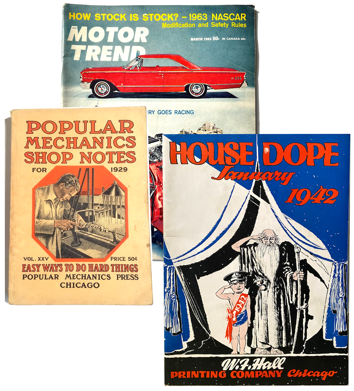 Between 1925 and 1985, during its 60-year occupancy of a cavernous mega-complex in Chicago’s Belmont Cragin neighborhood, W. F. Hall held a claim as the largest printing company on Earth. If you picked up a magazine, flipped through a catalog, or read a paperback novel during that period, you were inevitably going to encounter the company’s handiwork. The Hall portfolio included not only the popular mid-century Motor Trend magazines in our museum collection, but, among others: the hefty mail-order catalogs of Montgomery Ward, Sears, and Spiegel; the dime novels of Bantam and the New American Library; dentist’s office publications like Newsweek and Reader’s Digest; and some of Chicago’s culture-defining contributions to America’s sidewalk newsstands—including Esquire (founded by Arnold Gingrich in 1933), Playboy (founded by Hugh Hefner in 1953), and both Ebony and Jet (founded by John H. Johnson in 1945 and 1951, respectively).