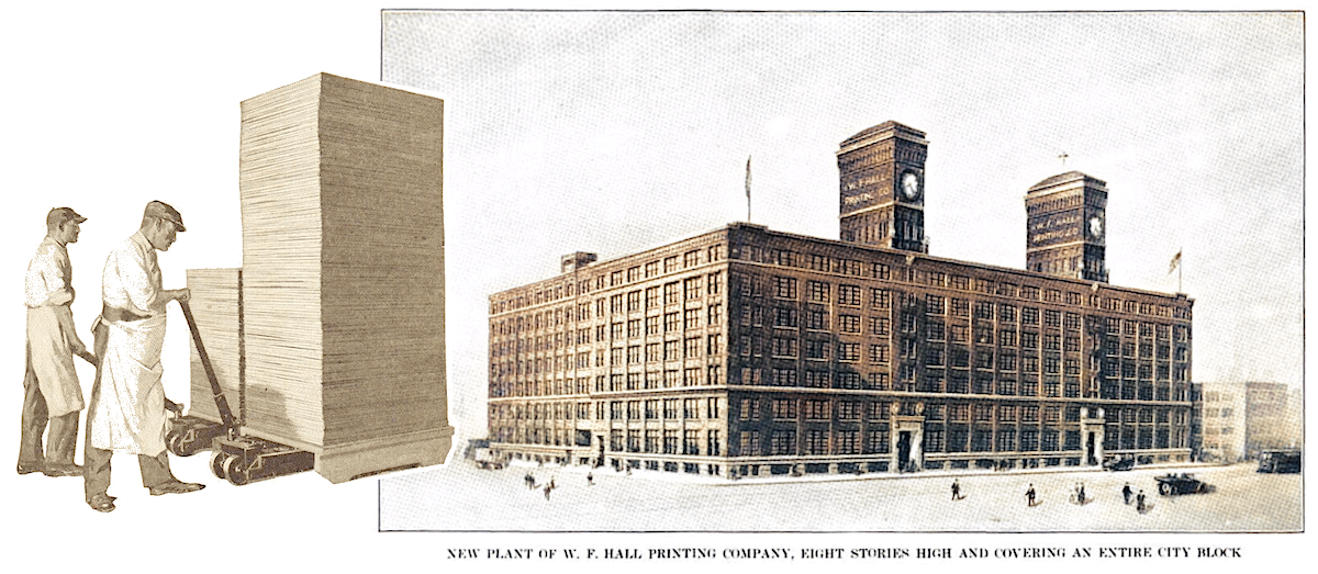 “Since Gutenberg invented printing at Mentz about 1450, the brains of every generation have done their utmost to make improvements, until today a trip through the great home of the W. F. Hall Printing Company shows the perfection and almost human instinct of every improved device intended to do the job better and save time and possibly considerable money in labor.” —Inter Ocean newspaper, 1912