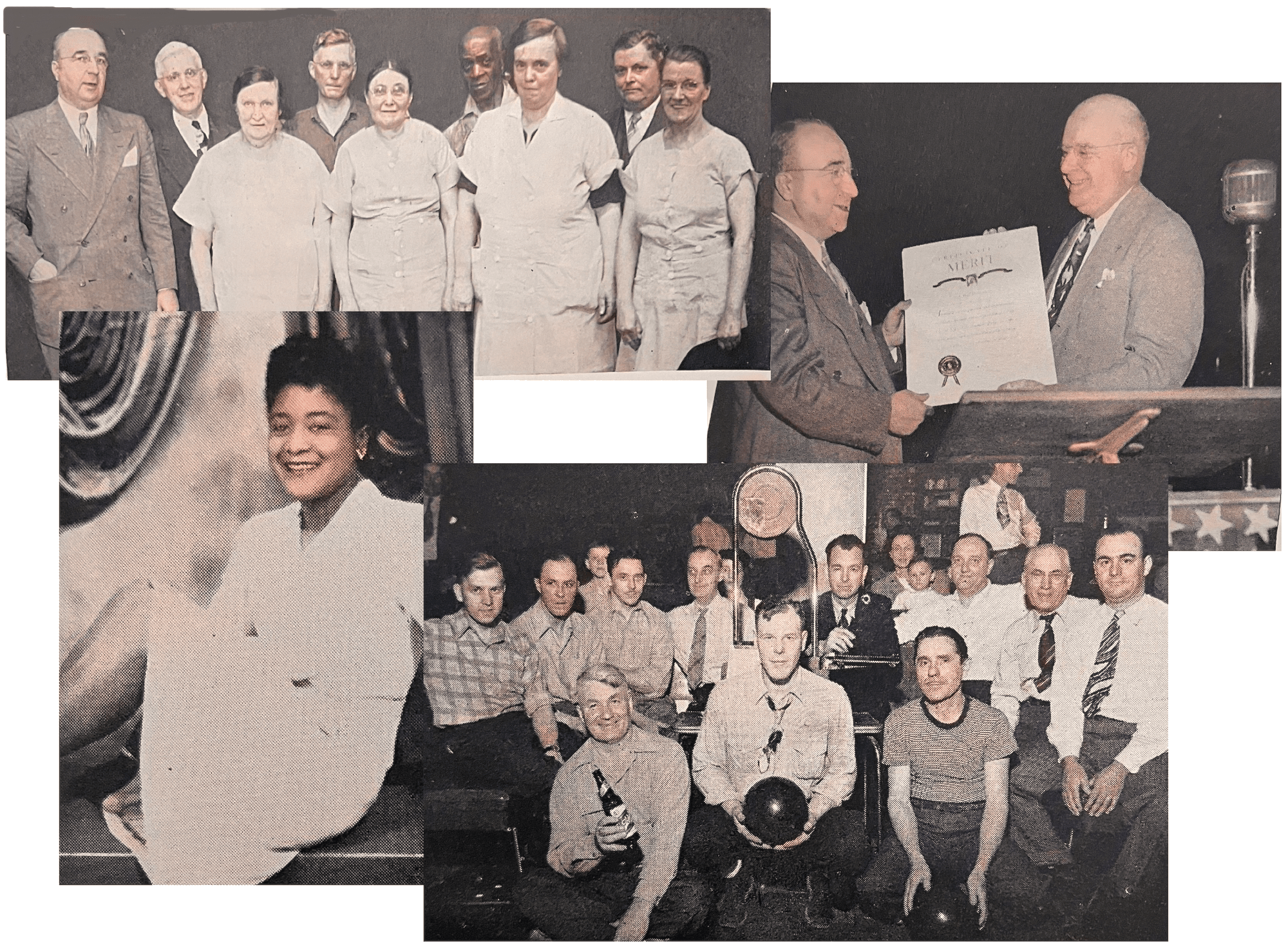 [W.F. Hall workers pictured in “House Dope” during the war years. Top Left: W.F. Hall president Alfred Geiger with eight veteran employees: (back row) Thomas Walsh, John O. Peterson, Buel Johnson, and Gus Baier, (front row) Ella McQuinn, Margaret Neeson, May Flaherty, and Kathleen M. Smith. Bottom Left: “Miss Grant,” described as the “Pin-Up Girl” of the Montgomery Ward line’s night shift. Top Right: Geiger is presented a certificate of merit by A. E. Geigenback, Public Printer of the U.S. Bottom Right: Members of the company bowling league, representing the Chicago Rotoprint 2nd Shift and Central Typesetting’s No. 2 team]