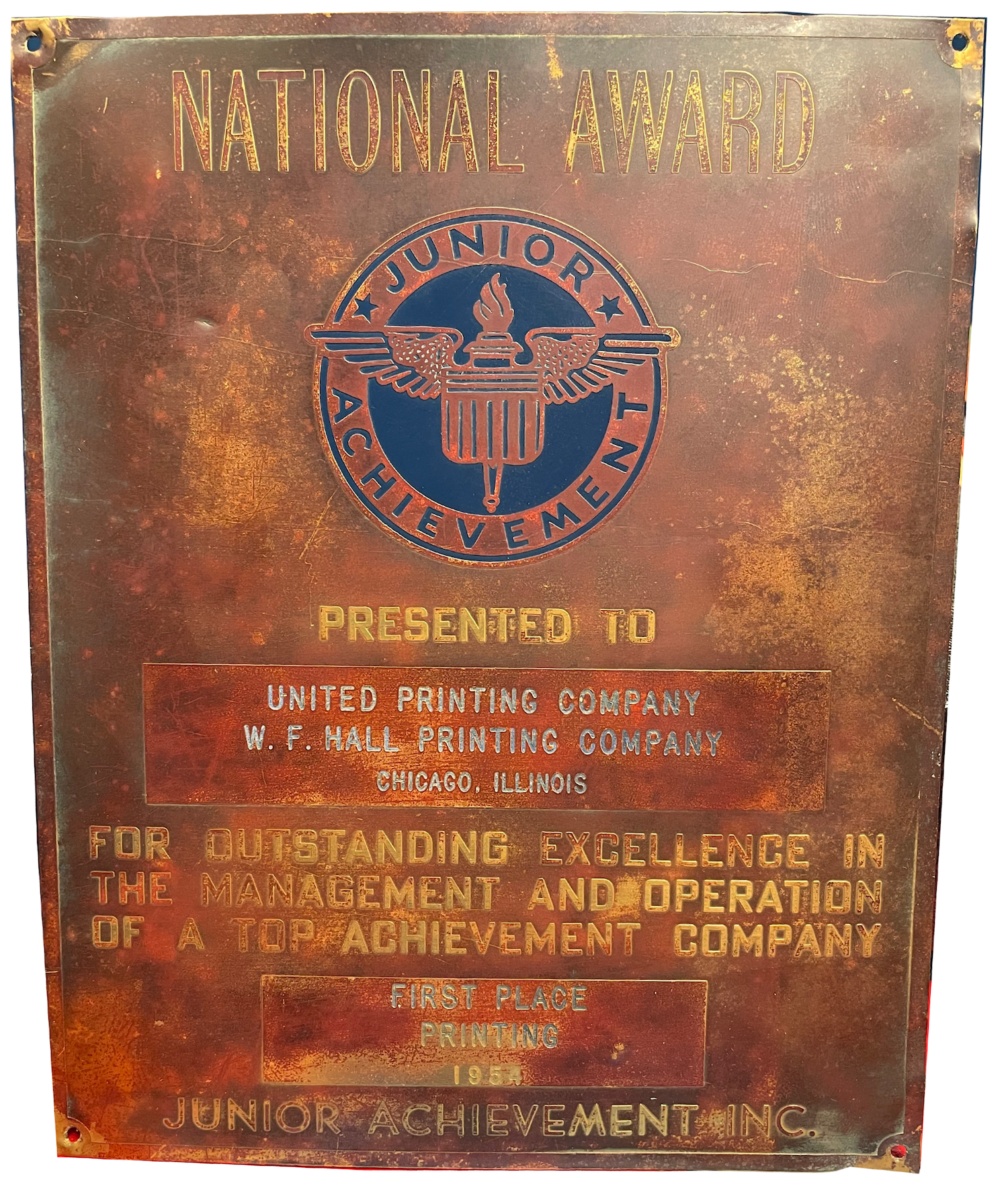 [This Junior Achievement plaque, awarded to W. F. Hall Printing in 1954, was recently found in the Klairmont Kollections building.]