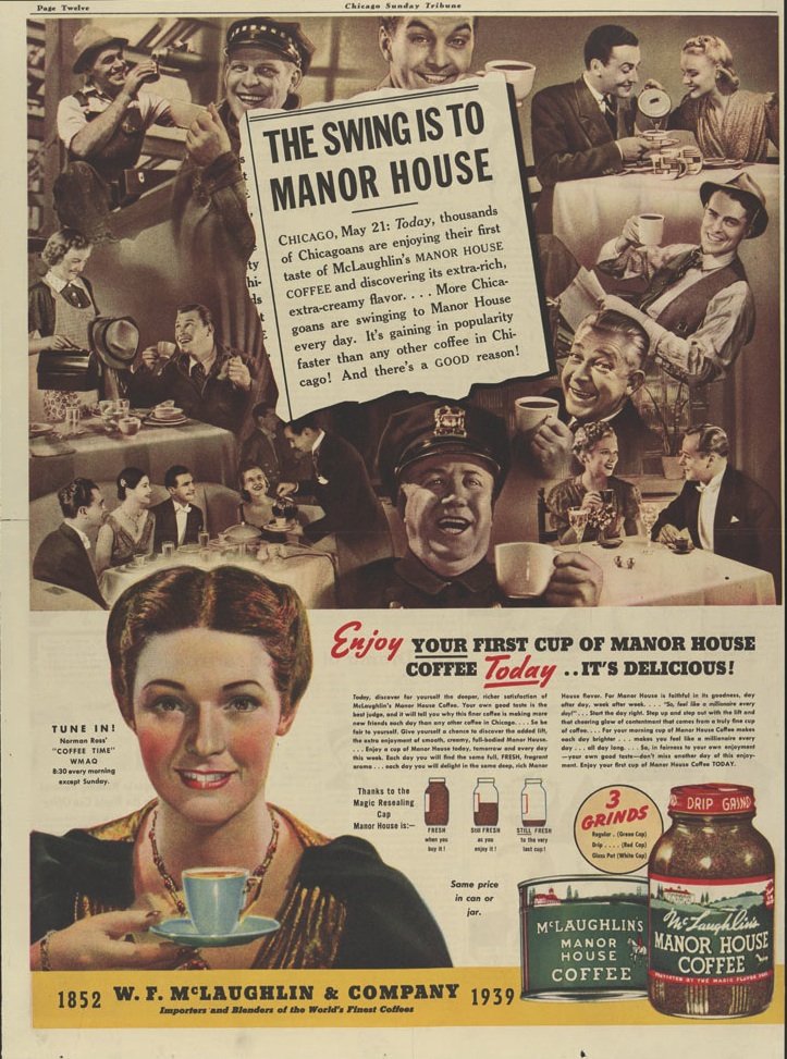 In one ad from 1940, a grinning husband turns to his wife after she pours him a cup. “I was sure lucky the day I married you,” he says, “this coffee beats anything I ever drink.” The ad copy continues from there: “To win praise like this from your husband, guests and friends, serve McLaughlin’s Manor House Coffee! Blended of choice coffees so rare we can supply it to only a limited market in and near Chicago! Roasted as only the McLaughlin craftsmen, with nearly a century of experience to guide them, know how! For keener coffee enjoyment every time, try McLaughlin’s Manor House Coffee now!”