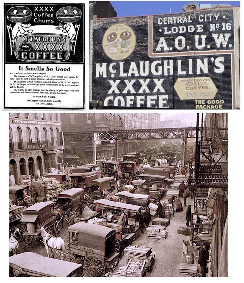 [Top Left: McLaughlin’s ad from 1906 featuring mascots known as the “XXXX Coffee Chums.” Top Right: A surviving ghost sign on the side of a building in Central City, Colorado, photographed in 2012 by Patricia Henschen. Bottom: A typical day on Chicago’s South Water Street market, 1910s]