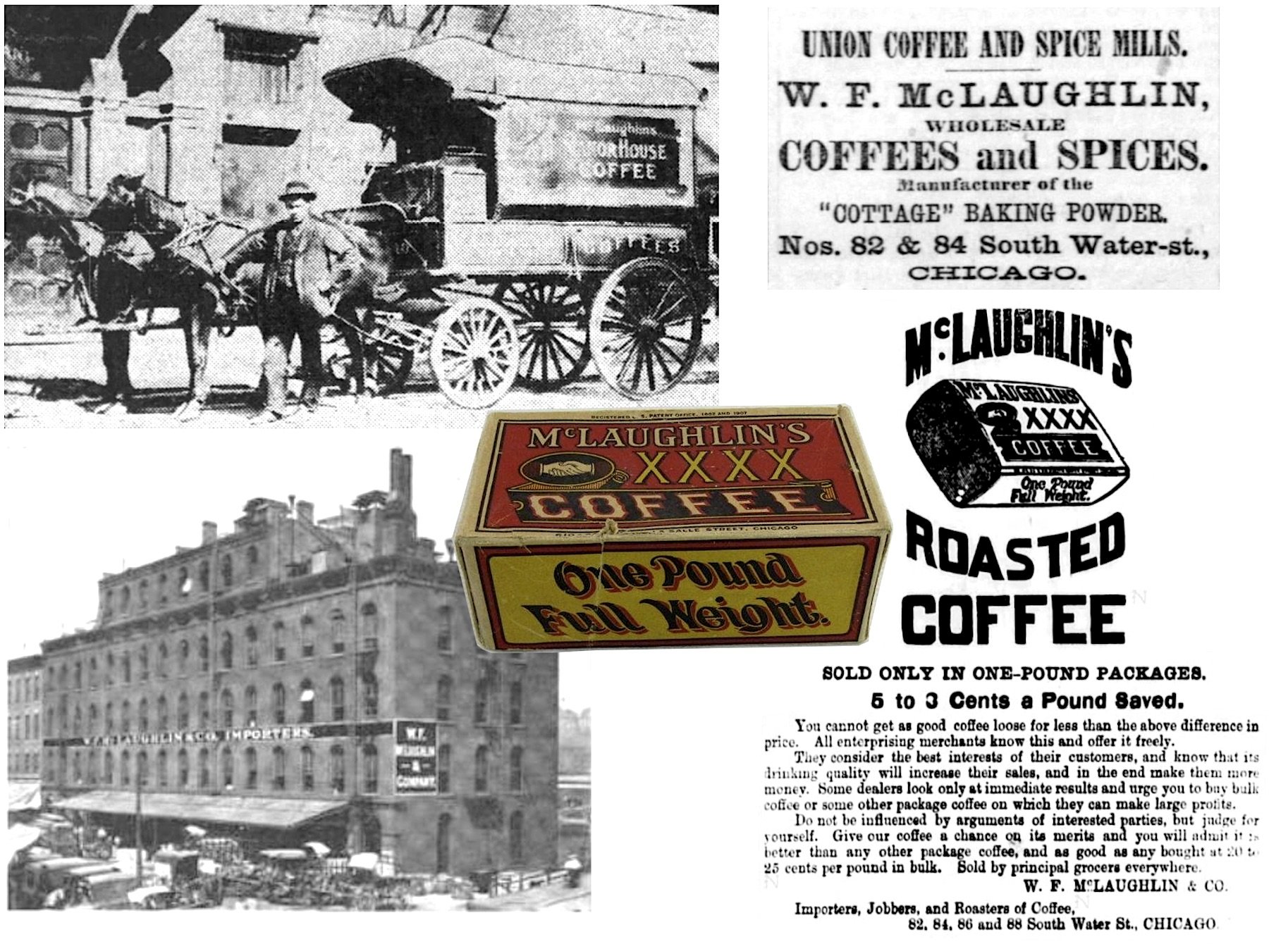 [Top left: McLaughlin delivery wagon, c. 1890s. Top Right: McLaughlin ad from 1877. Bottom Left: The McLaughlin building at 82-96 South Water Street, c. 1900. Bottom Right: XXXX Coffee ad from 1887]