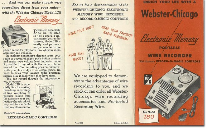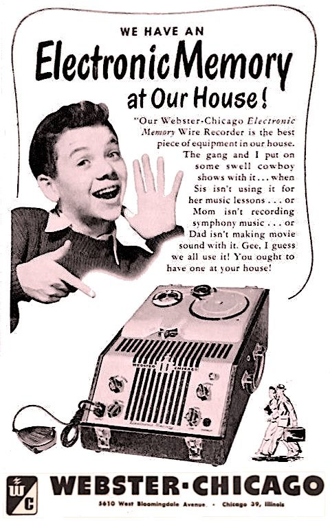 “The Electronic Memory is truly one of the most useful additions to the modern home. Not only does it afford the never-failing amusement of hearing one’s own voice or dramatic productions, but it is also invaluable for wire-recording outstanding programs and fine music from radio or record discs, speech development, family events, the voices of growing children, and home movies.” —Webster-Chicago advertisement, 1948