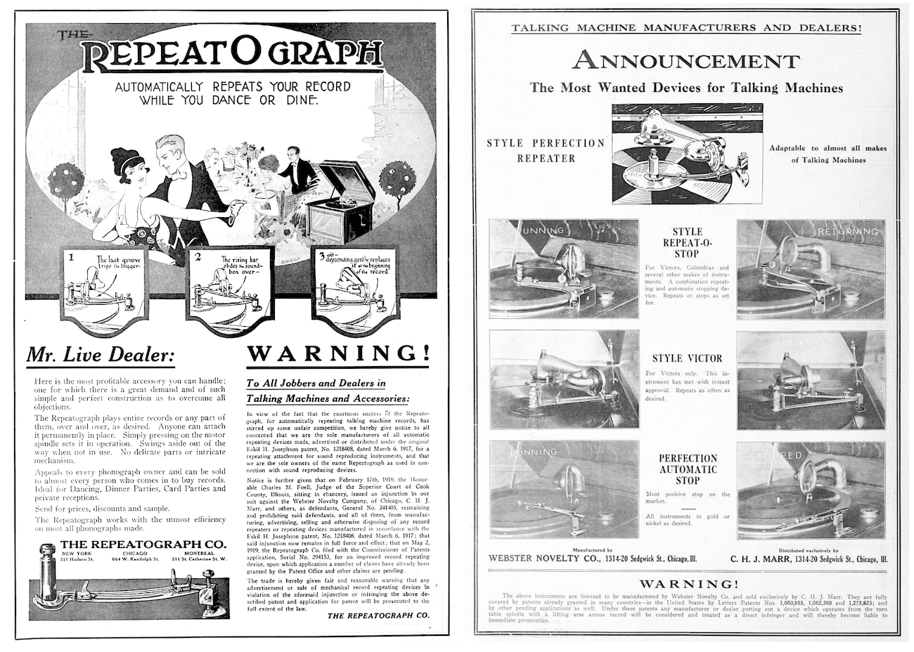 “The purpose of this new organization,” according to a press release in the October 1921 issue of Talking Machine World magazine, was to “manufacture and sell under an exclusive license agreement all forms of automatic, repeating devices for sound-reproducing instruments under the patents heretofore used by the Repeatograph Co., by the Webster Novelty Co. and others. In other words, the new company states that the war which formerly existed among the Repeater Stop, Repeat-O-Graph and Webster Novelty Co. has come to an end, and that the inventors of all patents used by these former companies have buried the hatchet and placed all of their eggs in one basket.”
