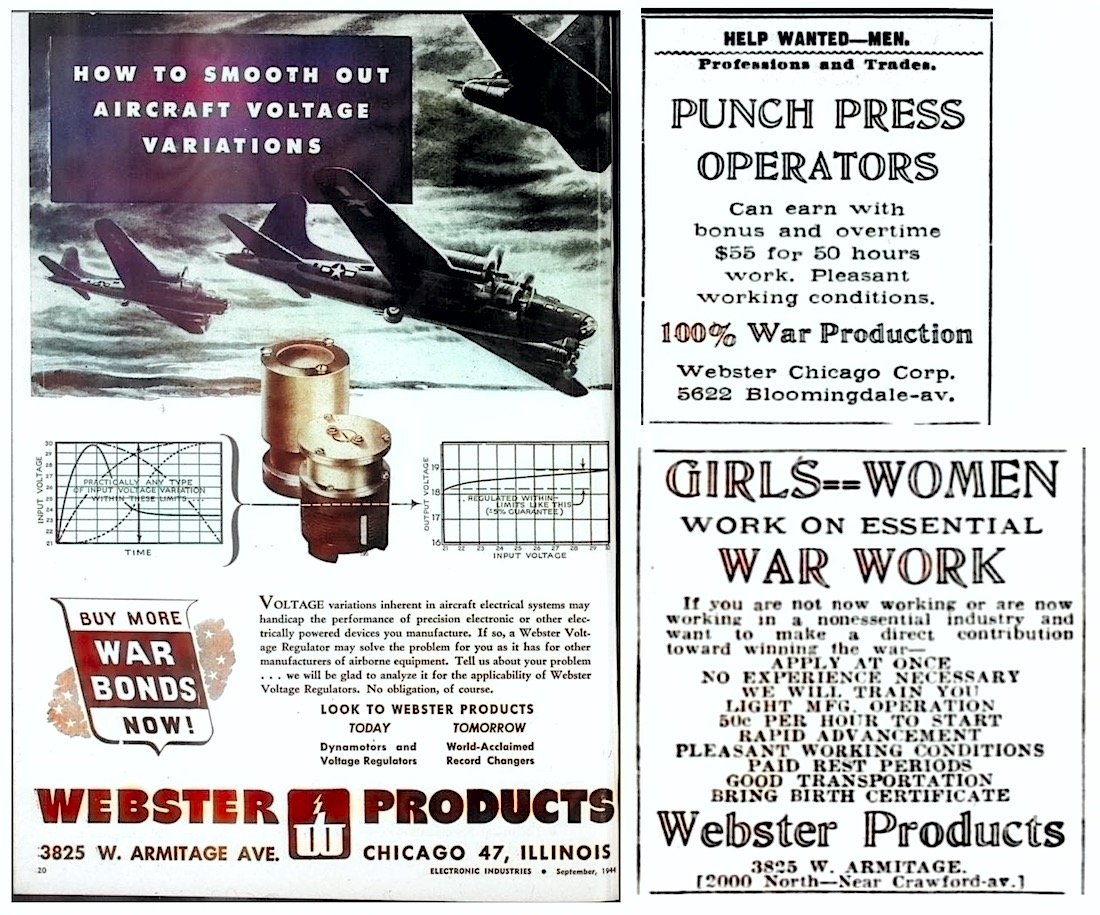 During World War II, Webster turned all its resources over to defense work. For two years, the company also split into two somewhat separate entities. The original Webster-Chicago Corp., at 5622 W. Bloomingdale, continued manufacturing “tools and dies, metal stampings, machine parts, and special apparatus,” while a new operation called Webster Products took over a plant at 3825 W. Armitage Avenue, producing “dynamotors, generators, inverters, small motors, voltage regulators, and special instruments.”