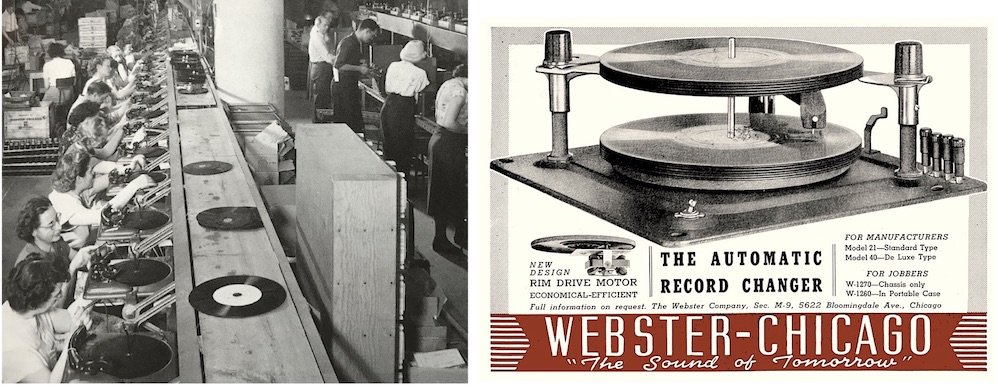 “To the crowds on Main Street has come the crowning luxury of home entertainment,” read a 1940 ad, “the full hour of music automatically played as pre-arranged to the individual taste of the hostess or of her guests. Webster-Chicago’s sturdy, dependable, jam-proof record changer at moderate cost has opened the door wide to volume sales of luxury instruments (and to bigger sales of records, singly and in series).”
