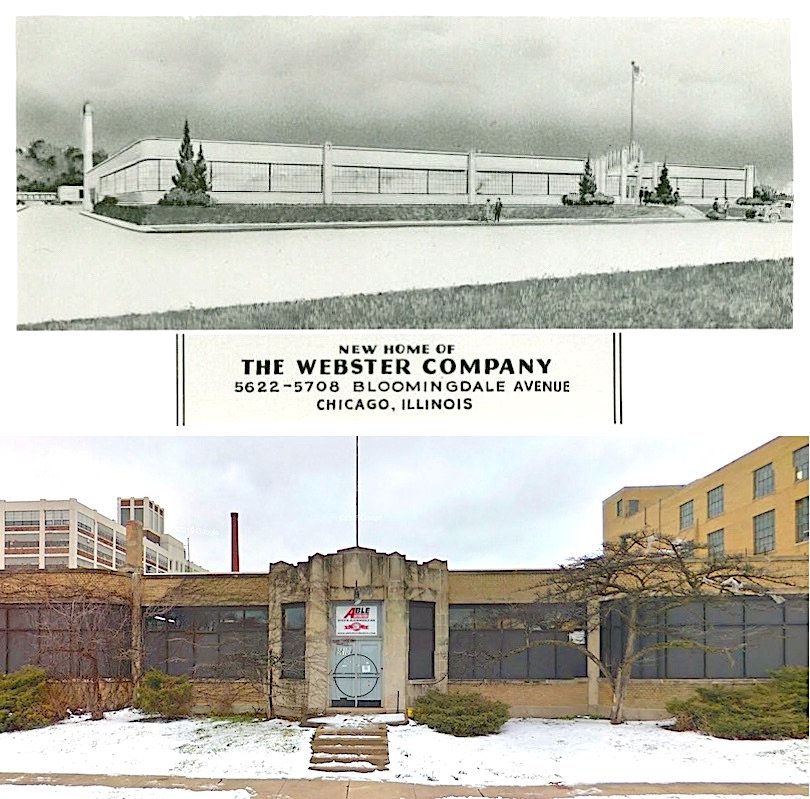 [Above: Assembly line at the Webster-Chicago factory, c. 1940s, and a 1940 ad for the Webster-Chicago Automatic Record Changer. Below: Then and Now of the Webster plant at 5622 W. Bloomingdale Ave., 1940 and 2020.]