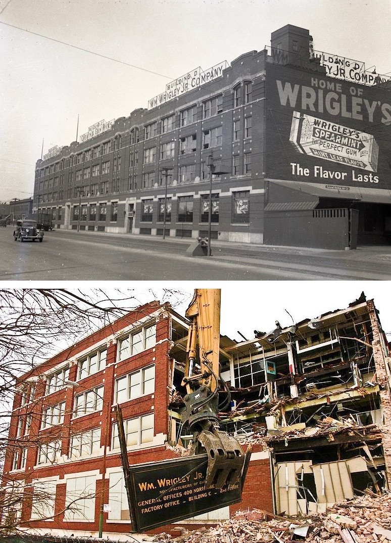 [The Wrigley Gum factory at 3535 S. Ashland Ave., thriving in 1933 (roughly the year our vintage Spearmint pack was made) and in the process of demolition in 2016]