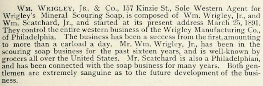 [Excerpt from the 1891 book Chicago and Its Resources 20 Years After, discussing the upstart Wrigley business before chewing gum was even involved]