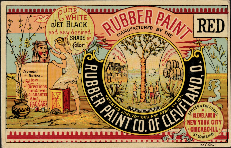 “For many years, chemists and others have experimented in mixing India Rubber with Oil, Lead, etc., in order to produce a perfectly water-proof paint, and at last, successful in the effort, have formed a chemical combination of Rubber with oil paints, which, when applied, becomes hard and elastic enough to not crack or peel from the action of the atmosphere, with a gloss equal to work finished with varnish. The Rubber Paint Company, of Cleveland, Ohio, own all the patents covering perfect combinations like the above, which is known and sold by them as ‘RUBBER PAINT.’” —Rubber Paint Co. catalog, 1880