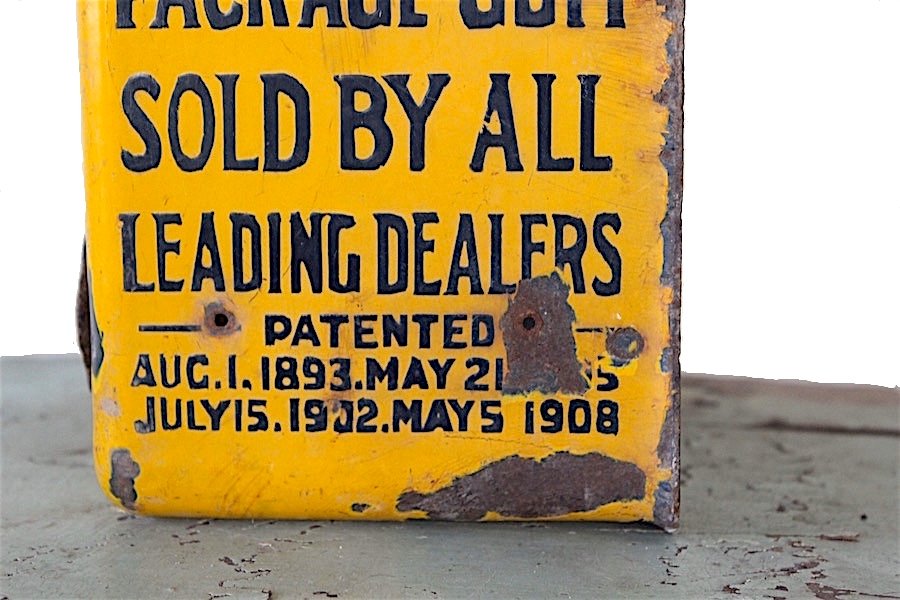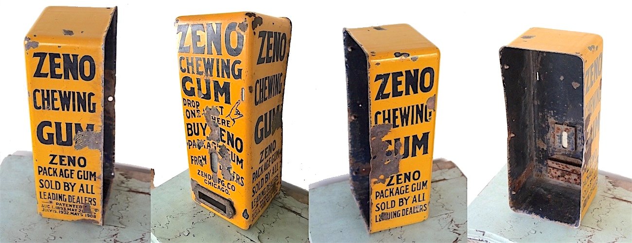 Vending machines in any form had only existed since the late 1880s, so the idea of being able to pay 1-cent for a fresh piece of delicious “Blood Orange” Zeno gum wasn’t just appealing to kids, it was a hoot for the grownups, as well. The inner clockwork mechanism of the machine (which, unfortunately, is not part of our gutted artifact) used to fascinate customers who would encounter the Zeno boxes in pharmacies, barber shops, pubs, etc. When the bright yellow boxes started appearing around 1905, they were particularly hard to miss.